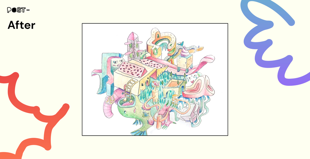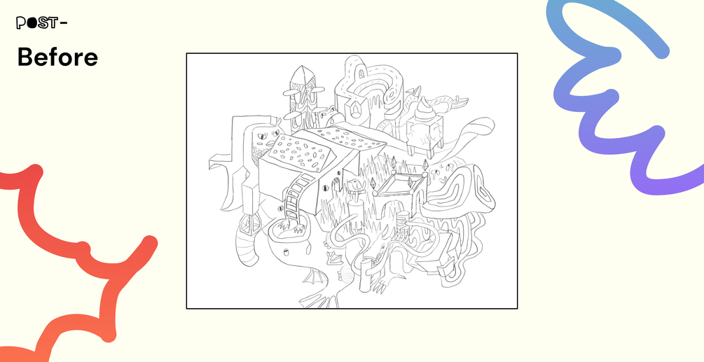 For this lineart, I felt like an architect. I constructed these fun buildings that didn't have structural integrity. For the building with little circles on top, I was inspired by this Muji store and playground built in Japan. After sketching that building, I began to think of the surrounding buildings and objects as a playground set.